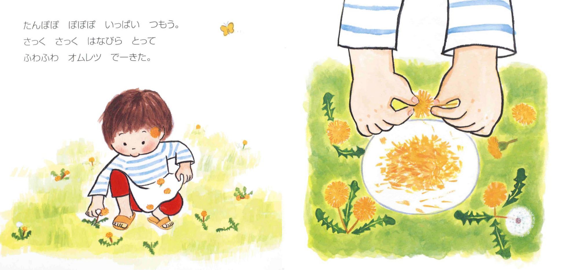 たんぽぽの花びら、芝生などの細長い葉っぱ、お団子に赤いアザミ?のような花でデコレーション、なんて素敵な誕生日会なんでしょう。お人形を相手に、とてもかわいいおままごとの様子が手に取るようにわかります。まだ冬なのでお花はありませんが、ぜひ季節がよくなったらおままごとを外でやろうね、と話していました。遊びが膨らんでいく絵本で、女の子にはおすすめの一冊ですね。 (minatsuさん 40代・ママ 男の子6歳、女の子2歳)