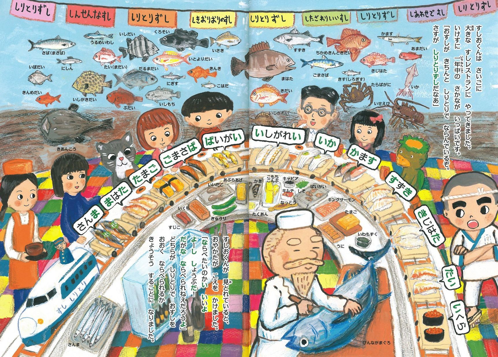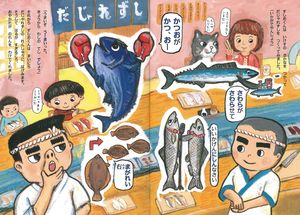 修行をつんだすしおくんがのれんをわけてもらい、また違う町のおすしやさんを訪れると、そこでにぎっていたのは、なんと「あいうえおずし」。はじめの文字をつなげると、さかなの名前になっている!?上昇志向の強いすしおくんは、ここでも修行をつんでマスターします。すると、上には上がいるもので。「かいぶんずし」「ならべかえずし」「しりとりずし」・・・なんとまあ、さまざまなおすしやさんと親方がいるものです。