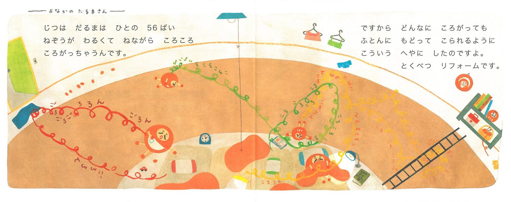 森のマンションに、だるまさん一家が引っ越してきました。だるまさんのお家に招待していただいた森のみんなはびっくり!まあるいだるまさんならではのいろんな工夫がしてあったのです。