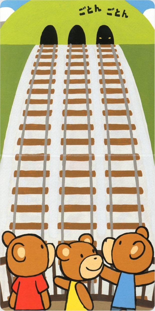 橋の下にある3本の線路は、向こうの山の3つのトンネルから真っ直ぐのびています。 「ごとんごとん」 かすかな音と一緒に、一番右側のトンネルの中に見えるのは小さな灯りがふたつ。 ページを開くと… 「ごー!」 電車が走ってきたよ。くまくんたちも大喜びです。 「ごとんごとん」 あ、今度は一番左のトンネルから…貨物列車だ。その次は? 他にもSLに新幹線まで!子どもたちの大好きな電車が次々に走ってきます。