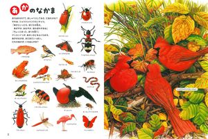 「あかのなかま」には、子どもたちにおなじみのナナホシテントウ、真っ赤なボディに黒の口元がアクセントのおしゃれな鳥・ショウジョウコウカンチョウ、赤黒白の縞模様が特徴のミルクヘビ。