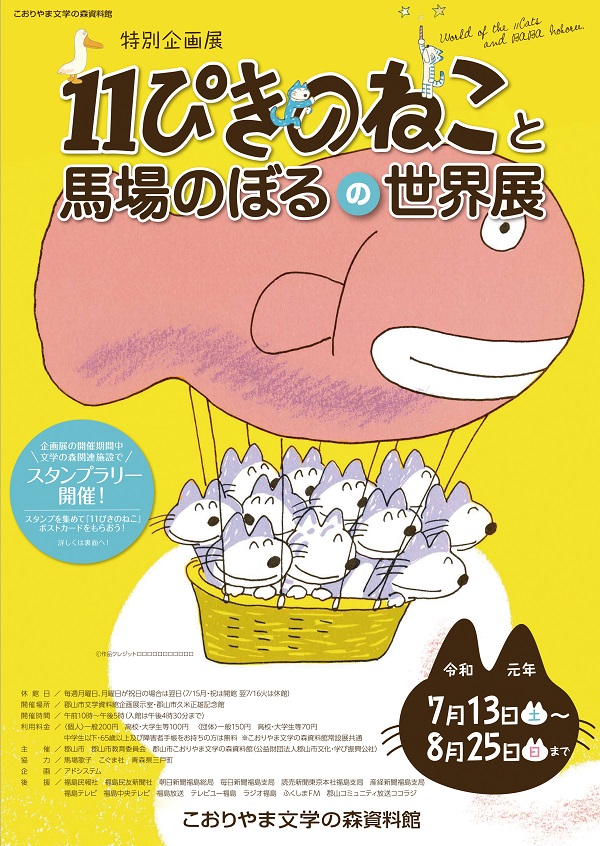 1967年の第一作誕生から今日まで、そののびやかな表現とユーモアあふれるストーリーで子どもから大人まで幅広い世代に愛され続けてきた「11ぴきのねこ」シリーズ。 その絵本原画や資料、作品を通して、馬場のぼるの創作の世界を紹介する展覧会が郡山市で開催されます。 期間中はスタンプを集めると「11ぴきのねこ」のポストカードがもらえるスタンプラリーも開催されます。 夏休みは郡山へ親子でGO! 開催期間:2019年7月13日(土)〜8月25日(日) 開場時間:10:00〜17:00(入館は16:30まで/月曜休館) 場 所:こおりやま文学の森資料館/郡山市文学資料館企画展示室・久米正雄記念館 福島県郡山市豊田町3-5 TEL:024-991-7610 観 覧 料 :一般 200円 高校・大学生 100円 65歳以上/中学生以下無料 |
