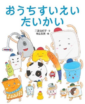 2021年11月発行『おうちおおずもう』、2022年2月発行『おうちりくじょうグランプリ』に続く、おうちスポーツ絵本シリーズ第3弾。家にある食器や家具、食べ物など「おそうじチーム」「あそびチーム」「おふろチーム」「たべものチーム」に分かれて、水泳のメドレーリレーを行う。手に汗握る大混戦の展開で、勝つのはどのチーム?