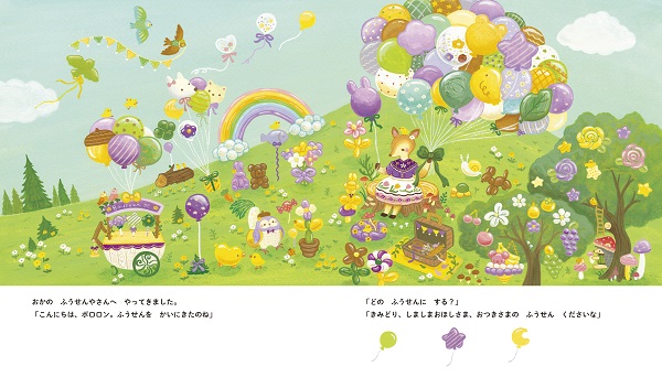 厨房から声がします。なんでも今日は森の子どもたちのパーティーがあるのに、材料が足りないと言うのです。そこでポロロンは一人で買いに行くことに。やおやさんにふうせんやさん、マーケットまでまわらなくてはいけません。無事に買い物はできるのでしょうか……?