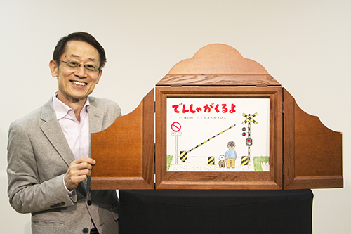 ぼくは日常の子どもたちとの生活の中で、おはなしの種を見つけることが多いです。この作品も、娘たちが小さいころ、毎日のように見に行った、西武新宿線の線路をモデルにしています。ラストの車掌さんの演出は、実際にぼくと娘が体験したことです。この紙芝居を演じるときのポイントは、1本電車が通過した後の「間」。この「間」を大切に演じると、本当に電車を待っているときのリアリティが出せます。