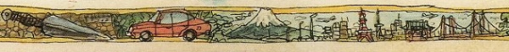 地図の縁に描かれているイラストも、とってもおしゃれ! 日本のページには、富士山や東京タワーとシュリケンなどが並んで描かれています。